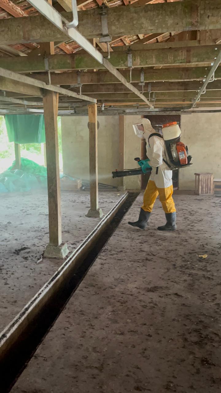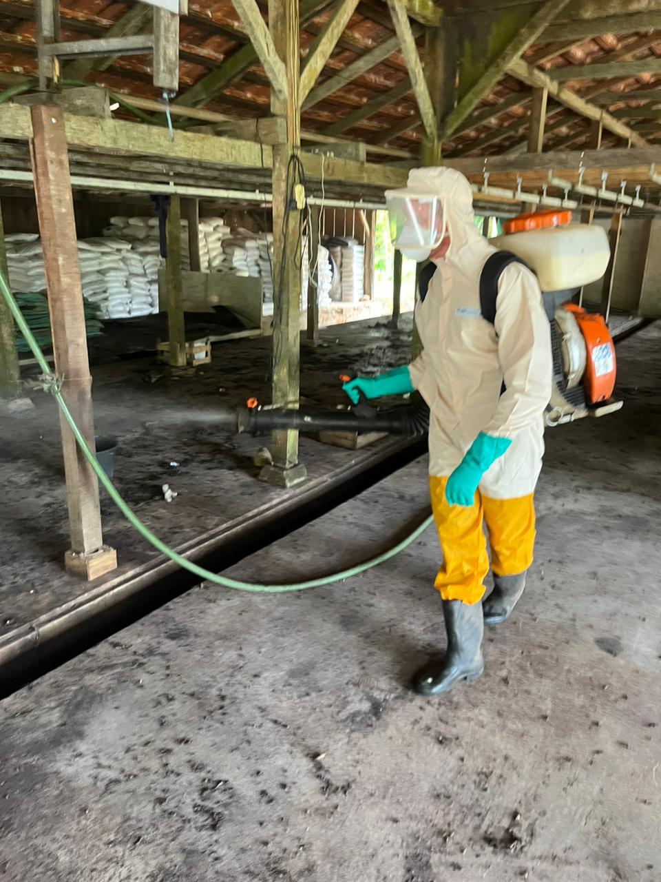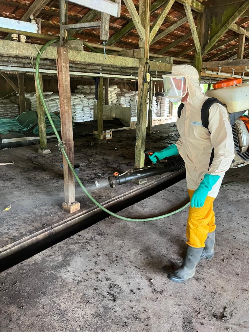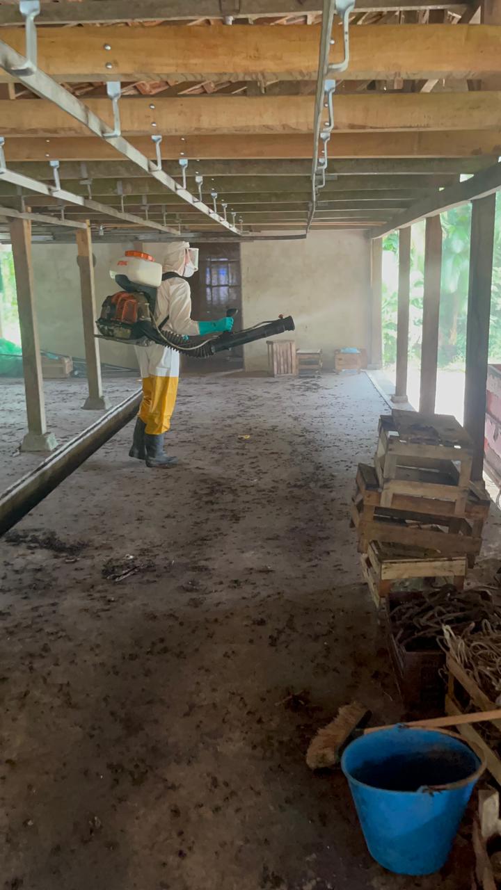 A aplicação foi realizada por pulverização residual, com diluição específica em água e uso de pulverizadores manuais.