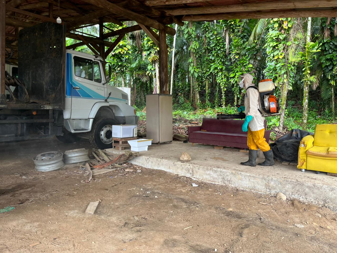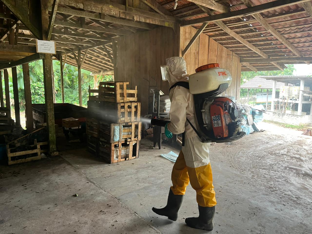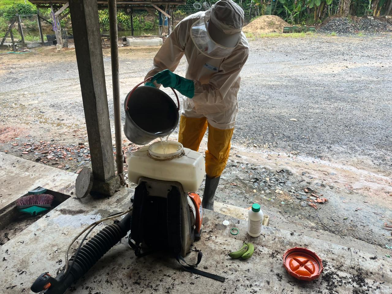 A aplicação foi realizada por pulverização residual, com diluição específica em água e uso de pulverizadores manuais.