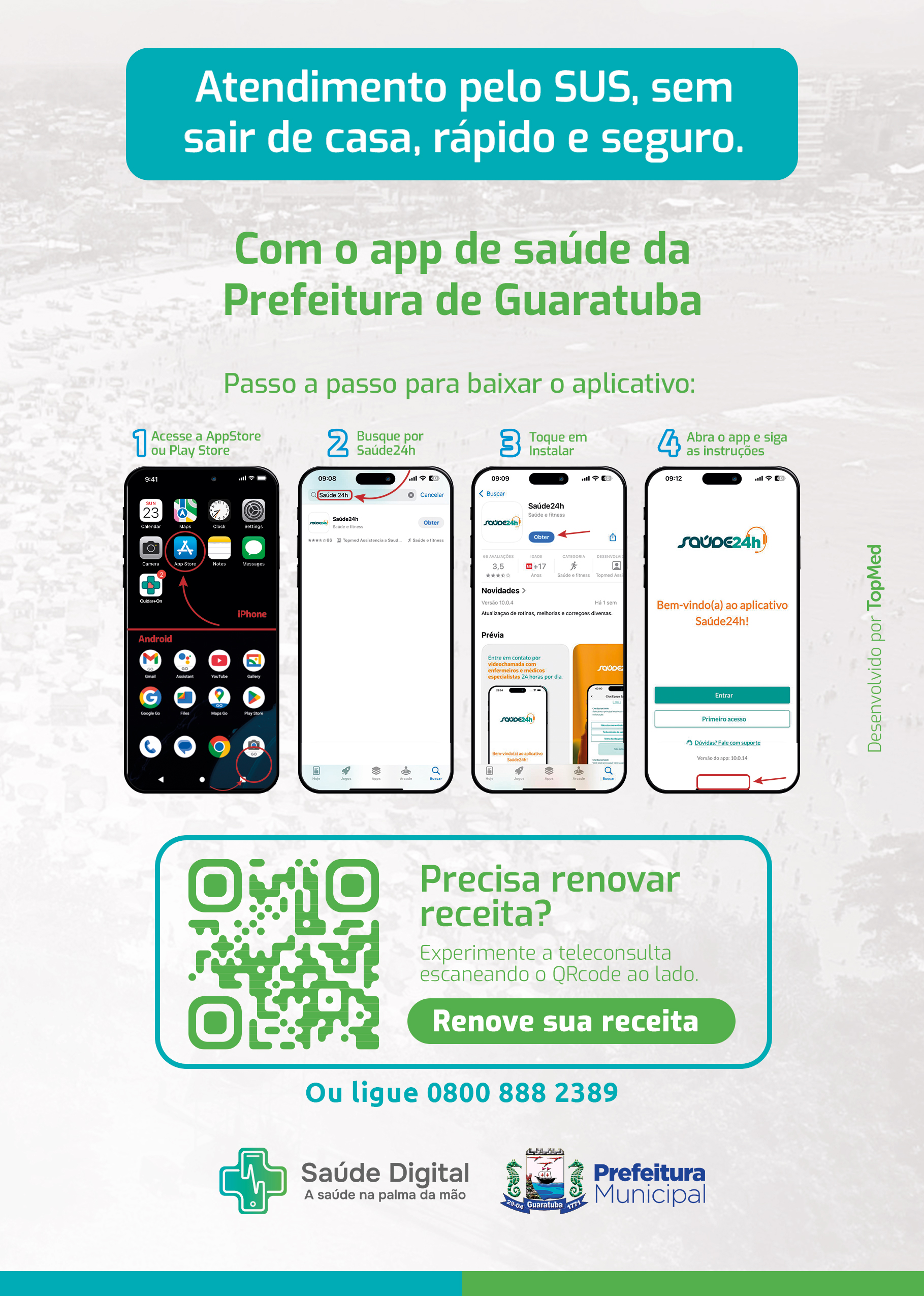 O atendimento está disponível 24 horas por dia, pelo aplicativo “Saúde 24h” (chat ou videochamada) ou pelo telefone 0800 888 2389. O serviço oferece atenção básica com profissionais de saúde da família, clínica médica e pediatria, incluindo triagem de enfermagem, consultas médicas, prescrição de medicamentos e solicitação de exames. O aplicativo também permite o envio de exames, e, quando necessário, o paciente é encaminhado para atendimento presencial na rede municipal.